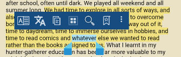 - 您可以移动单词周围的蓝色手柄来扩大文本选择,并使用参考工具栏上的按钮对选择进行操作,例如复制它、使用 Google 翻译、在词典中查找单词、设置书签、访问和搜索维基百科等
